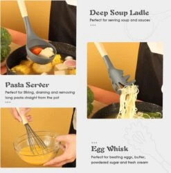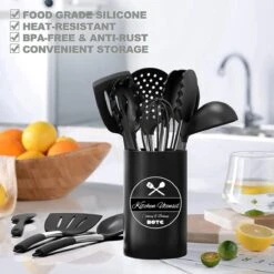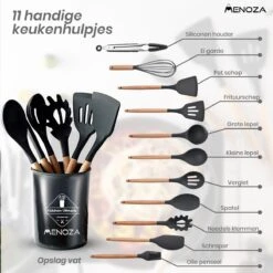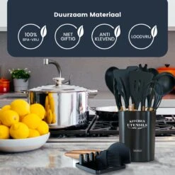 Keukengerei Set Met Houder – Kookgerei Set Spatel Pot – Keukengerei Keukenset – 12 Delige Zwart Hout