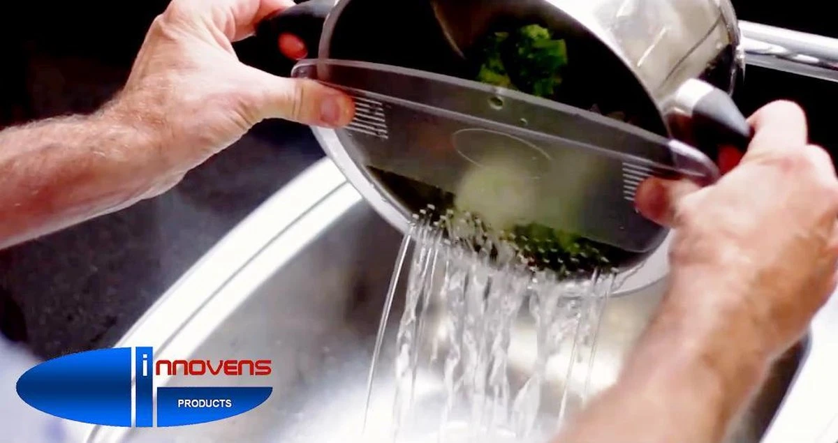 In tegenstelling tot het gebruik van de deksel tijdens het afgieten van kokend water, staat de Afgieter® deze handeling probleemloos toe.