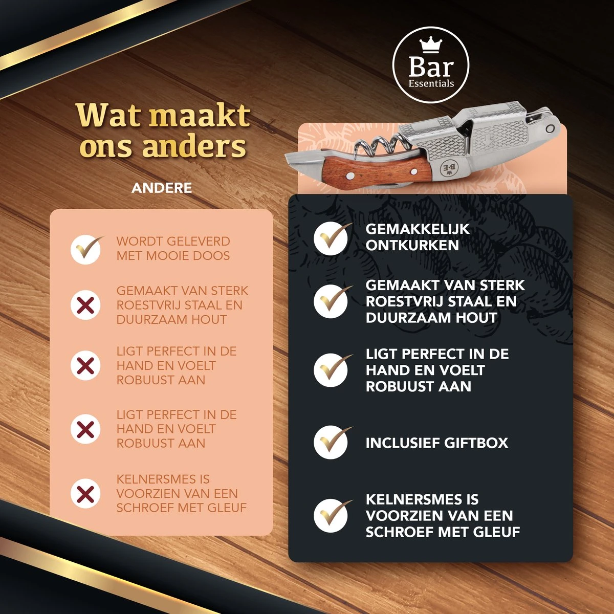 Het Bar Essentials Heavy Duty Kelnersmes is gemaakt van meerdere sterke materialen. Wij bieden jou een stevig en roestvrij staal materiaal, waar jij de rest van je leven mee vooruit kunt. In combinatie met het rozenhouten handvat heeft het kelnersmes niet alleen een luxe uitstraling, maar heeft die ook een robuuste houvast. Een prachtige toevoeging aan jouw keukenla en het perfecte cadeau om te geven.