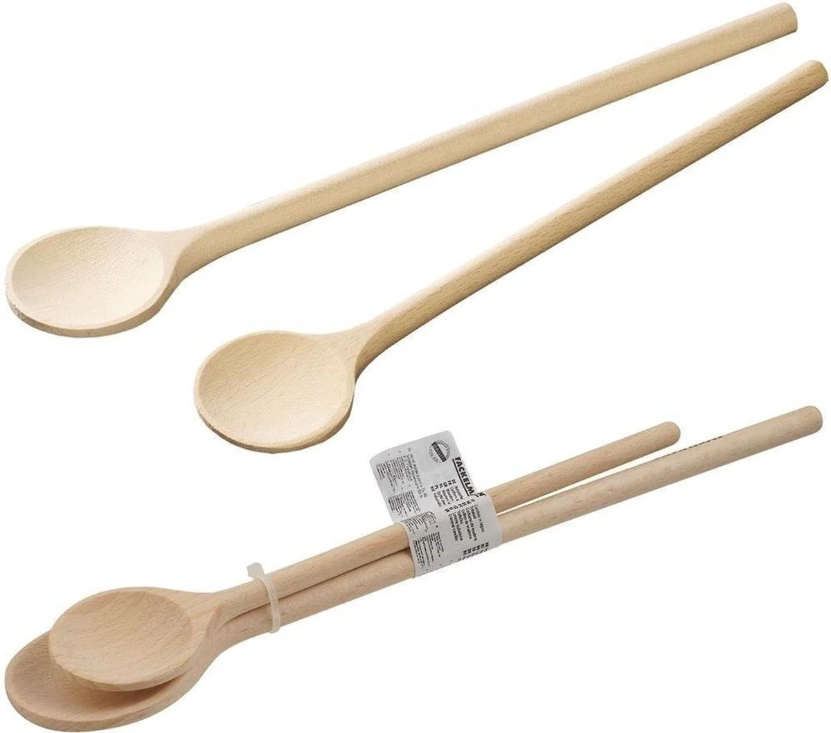 twee houten lepels van Fackelmann. De lepes zijn gemaakt van blank hout en hebben een lengte van 25 en 30 cm
