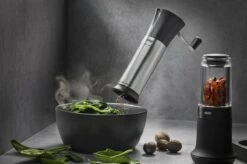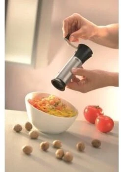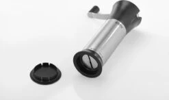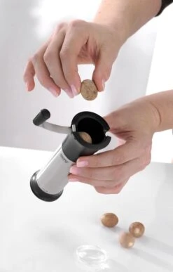 De Moscata nootmuskaatmolen is uitgerust met een Laser Cut maalwerk en maalt met gemak nootmuskaat en hazelnoten fijn. Daarnaast bevat de molen een geïntegreerd compartiment om maximaal 4 noten te bewaren. In de molen zelf kun je maximaal 1 noot tegelijk gebruiken om te malen. Wanneer je deze noot in de molen hebt geplaatst, kun je de molen dicht klikken om hem veilig te kunnen gebruiken. Dit kun je gemakkelijk zien aan de buitenkant door de woorden ‘open – close’. Daarnaast is de molen voorzien van een dekseltje om de smaak te behouden en de tafel schoon te houden. Om ruimte te besparen, kun je de hendel eenvoudig inklappen.