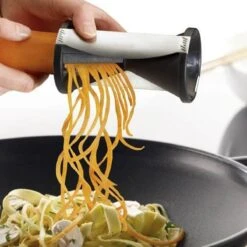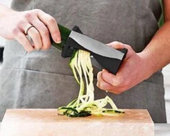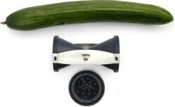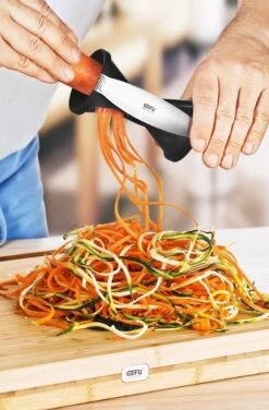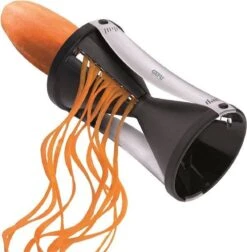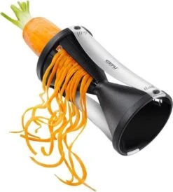 Spirelli, spiraalsnijder, juliennesnijder van Gefu. Met de spirelli tover je in een handomdraai eindeloze julienne-stroken uit groente. De Spirelli werkt eenvoudig, je gebruikt de snijder net als een puntenslijper. De Spirelli is voorzien van een handige resthouder met drie RVS pinnen die eenvoudig vast te klikken is. Hierdoor is het maken van groentespaghetti nog eenvoudiger!