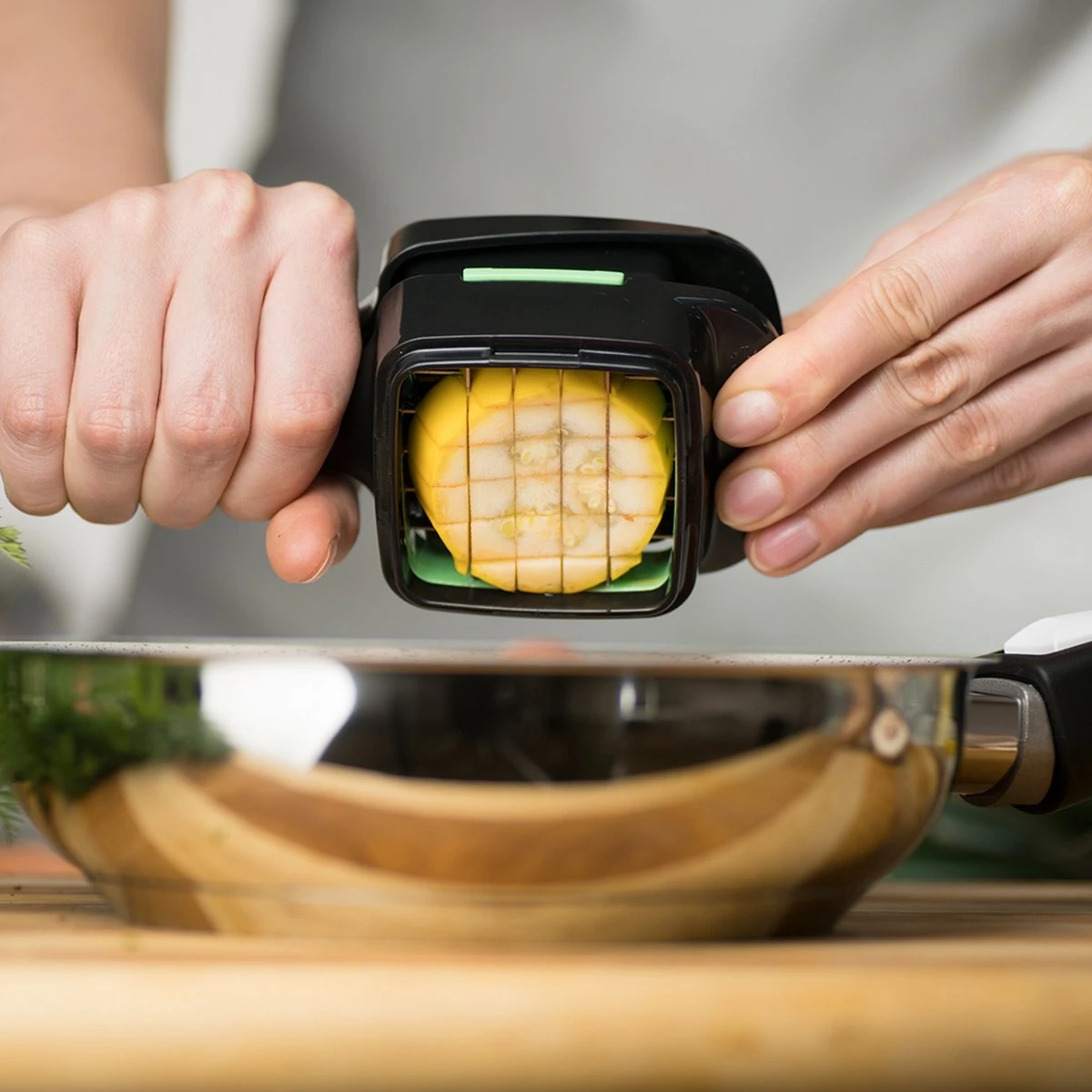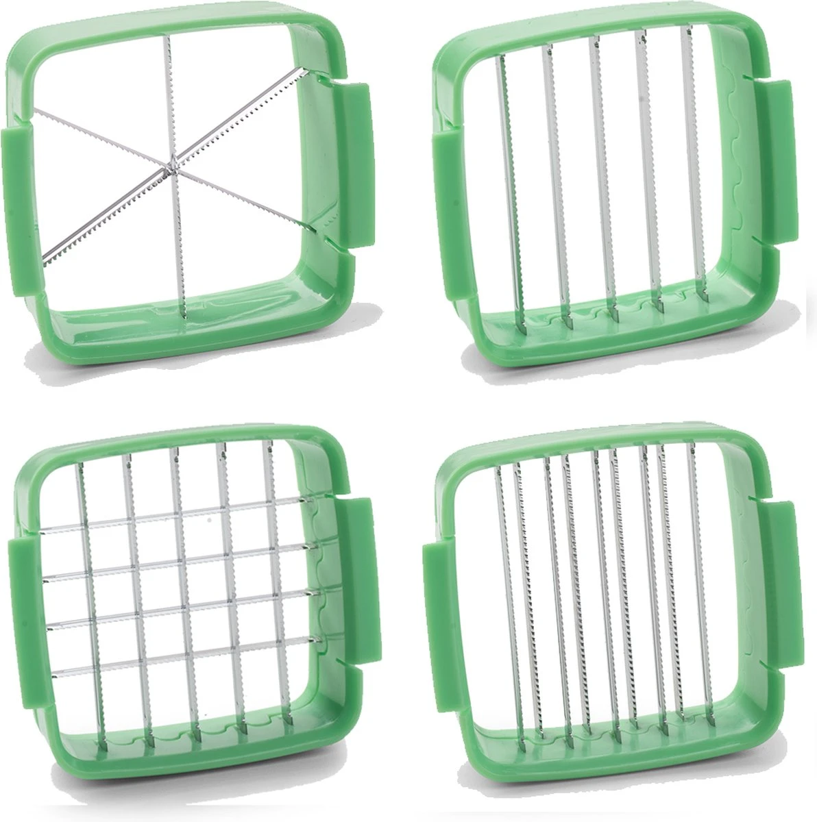 Leg het te snijden ingrediĂŤnt in het snijapparaat, druk aan en alles is perfect gesneden. Zowel harde als zachte levensmiddelen. De Nicer Dicer heeft 4 verschillende snij-opties waarmee groente, fruit en ei gesneden kan worden: