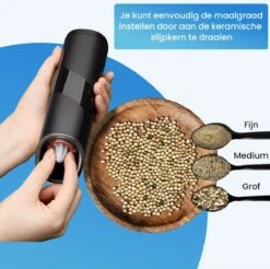 De Goga Elektrische Kruidenmolen is niet alleen geschikt voor peper en zout, maar ook voor kruiden zoals knoflookpoeder of komijn. Voeg jouw favoriete kruiden toe en stel de ruwheid van de molen in. Zo kun je peperkorrels bijvoorbeeld grover laten en komijn erg fijn malen.