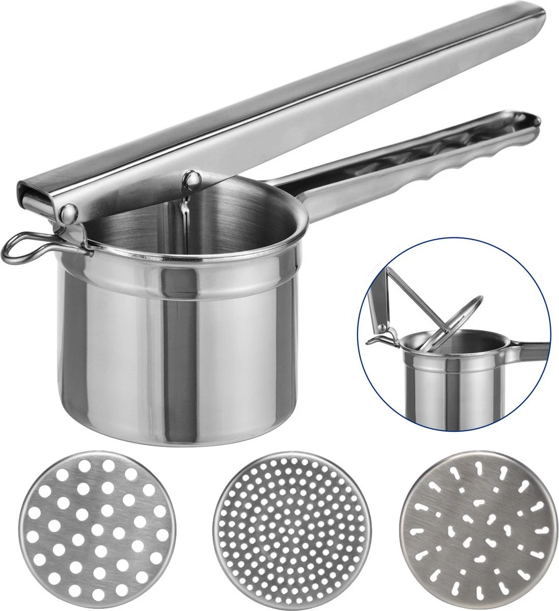 Maak de lekkerste purees en sauzen met deze aardappelpers. Het praktische van deze pers is dat je de aardappel, pasta, vruchten of ander ingrediënten direct boven de pan of schaal kunt verwerken. Deze sterke pers heeft een chique look en is zeer praktisch in gebruik. Voor het reinigen van deze pers spoel je hem af met warm water en een sopje. Deze pers is gemaakt van roestvrijstaal en heeft 3 verwisselbare schijven, zodat het voor allerlei producten te gebruiken is.