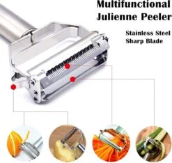 - MULTIFUNCTIONELE PEELER: AnGeer roestvrijstalen multifunctionele dunschiller met multifunctionele messen kan worden gebruikt voor het schillen of julienne van aardappelen, wortelen, appel, sinaasappel, komkommer en meer groenten en fruit. Het schillen, snijden en julienning zijn nog nooit zo eenvoudig geweest. De dunschiller is een door de chef geïnspireerde keukentool die je niet mag missen! Aardappelschillers zijn ook een geweldig cadeau voor je familie en je beste vriend.