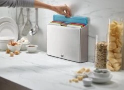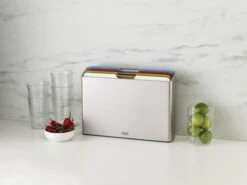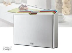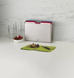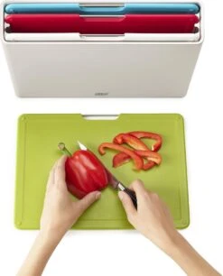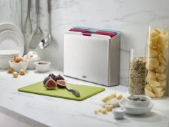 De Folio snijplanken set van Joseph Joseph bestaat uit vier grote snijplanken en een houder. Door vis, vlees, kip, groentes en brood op verschillende snijplanken te snijden voorkom je kruisbesmetting. Elke plank heeft een andere kleur, zodat je ze makkelijk uit elkaar kunt halen. De vier planken hebben een mesvriendelijk, gestructureerd snijoppervlak aan beide zijden. Daarnaast zijn ze BPA-vrij en beschikken ze over antislip voetjes, zodat de snijplank niet zal verschuiven tijdens het snijden van het voedsel. Na gebruik kunnen deze handige hulpmiddelen gewoon in de vaatwasser. Na het schoonspoelen berg je ze makkelijk op in de bijgeleverde houder.