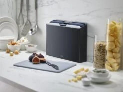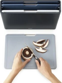De Folio snijplanken set van Joseph Joseph bestaat uit vier grote snijplanken en een houder. Door vis, vlees, kip, groentes en brood op verschillende snijplanken te snijden voorkom je kruisbesmetting. Elke plank heeft een andere blauwtint, zodat je ze makkelijk uit elkaar kunt halen. De vier planken hebben een mesvriendelijk, gestructureerd snijoppervlak aan beide zijden. Daarnaast zijn ze BPA-vrij en beschikken ze over antislip voetjes, zodat de snijplank niet zal verschuiven tijdens het snijden van het voedsel. Na gebruik kunnen deze handige hulpmiddelen gewoon in de vaatwasser. Na het schoonspoelen berg je ze makkelijk op in de bijgeleverde houder.