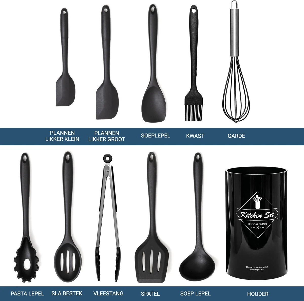 Omdat wij een set leveren met wel 11 verschillende kookgerei ben jij helemaal klaar voor alle gerechten uit alle keukens. Met de spatel, tang, schuimspaan en griltang maak jij van elke gerecht een culinair moment. Daarnaast ontvang jij ook een houder, waardoor jij alle spatels, tangen en kookgerei kan opbergen in de bijbehorende houder.