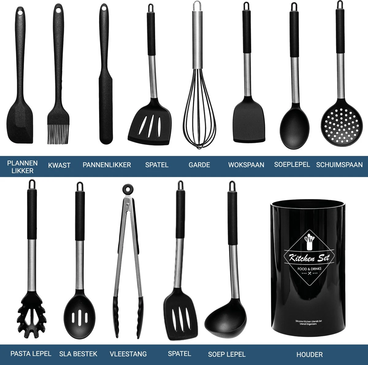 Omdat wij een set leveren met wel 13 verschillende kookgerei ben jij helemaal klaar voor alle gerechten uit alle keukens. Met de spatel, tang, schuimspaan en griltang maak jij van elke gerecht een culinair moment. Daarnaast ontvang jij ook een houder, waardoor jij alle spatels, tangen en kookgerei kan opbergen in de bijbehorende houder.