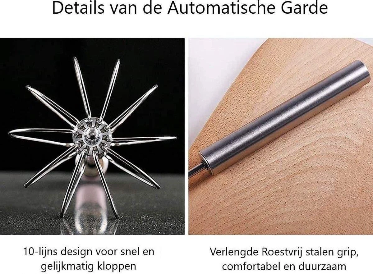 Het mechanisme van de garde zorgt ervoor dat je niet meer uit de pols hoeft te kloppen. De pols is vaak ĂŠĂŠn van de meest gebroken botten bij mensen en vaak dus ook een wat zwakkere plek. Druk de garde heel eenvoudig tegen de bodem van de kom of schaal waarin je wilt mixen en druk het handvat naar beneden. De garde zal uit zichzelf beginnen te mixen en zal zorgen voor een egaal beslag of geklutste eieren voor een heerlijke omelet.