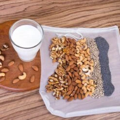 Perfecte sappen en notenmelk maken? Gebruik dan deze stevige notenmelkzak De super fijne zak is speciaal gemaakt om heerlijke drankjes te maken. De zak is gemaakt van nylon en heeft twee trekkoordjes om de zak dicht te maken. Door het gebruikte nylon is de zak schimmelbestendig en eenvoudig schoon te maken. De resten zijn makkelijk weg te spoelen en hij droogt sneller dan een zak met stof.