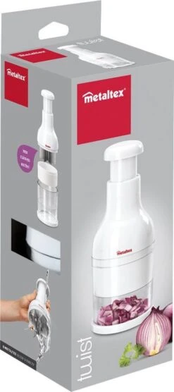 De Twist uien- en groentehakker is ideaal voor het hakken van uien en andere groente. Plaats de ui of groente op een snijplank en zet de Twist eroverheen. Met een paar simpele drukken snijdt u de ui/groente in kleinere stukken.