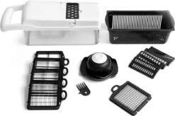 De beste functionaliteit op de markt – met 5 verwisselbare messen voldoet dit keukenapparaat aan al uw behoeften op het gebied van snijden, raspen en hakken. Kies de perfecte dikte van uw gesneden groenten met de gebruiksvriendelijke draaiknop en selecteer de ideale maat voor uw gesneden groenten door eenvoudig de inzetstukken te verwisselen.
