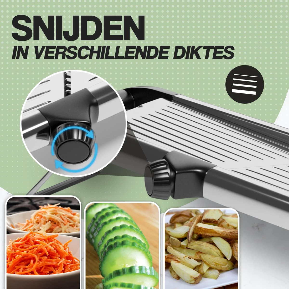 De verstelbare groentesnijder is een aanwinst voor elke keuken. Met verstelbare messen kan de mandoline elk ingrediënt aan en hoef je nooit meer opzoek naar extra keukengereedschap.