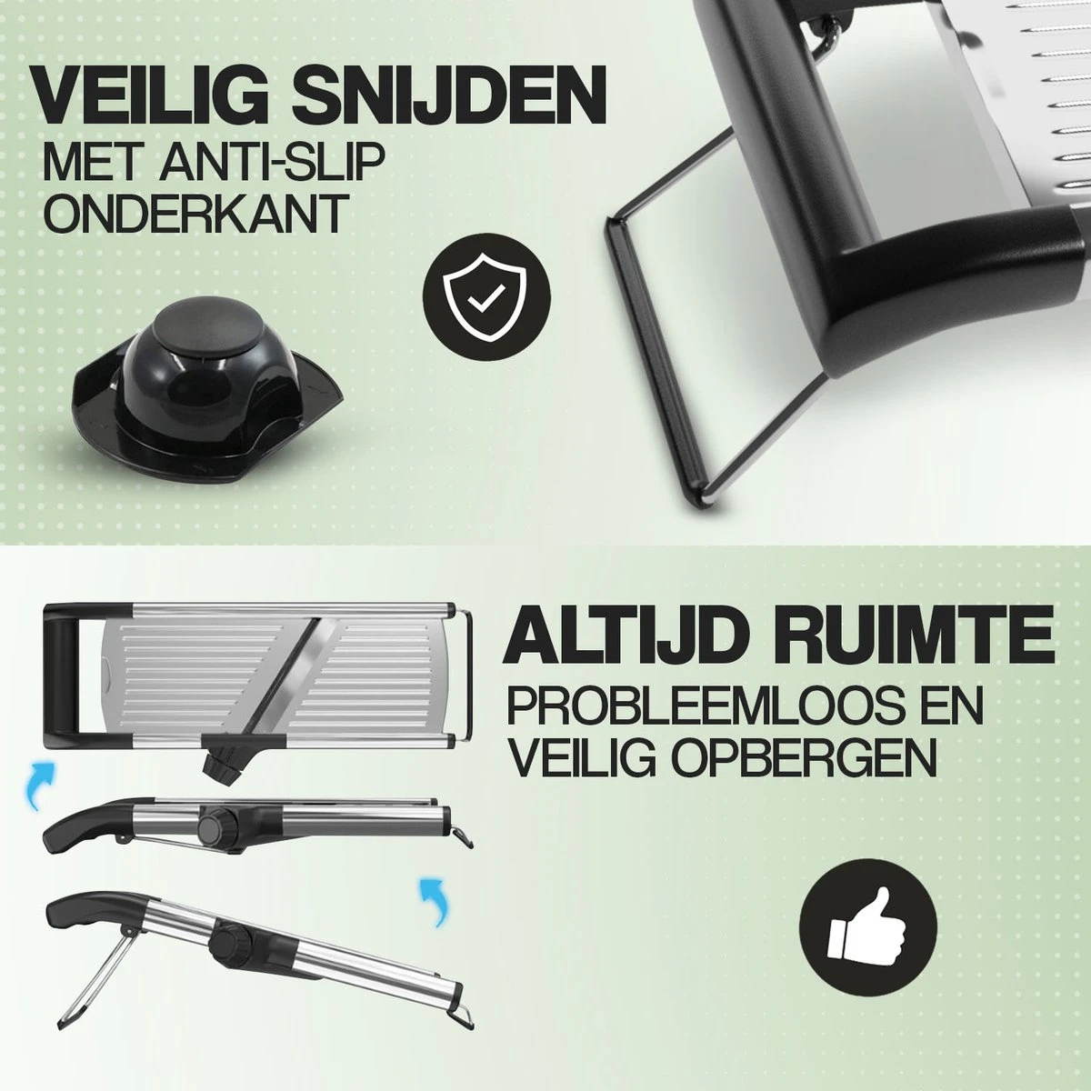 Het hoogwaardige materiaal en roestvrijstalen constructie garanderen een lange levensduur, terwijl het compacte ontwerp de mandoline makkelijk op te bergen maakt.