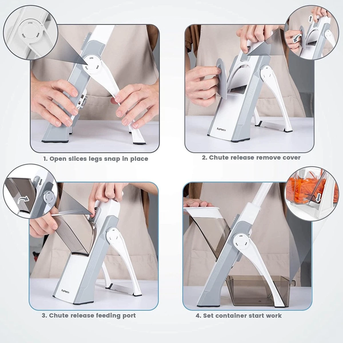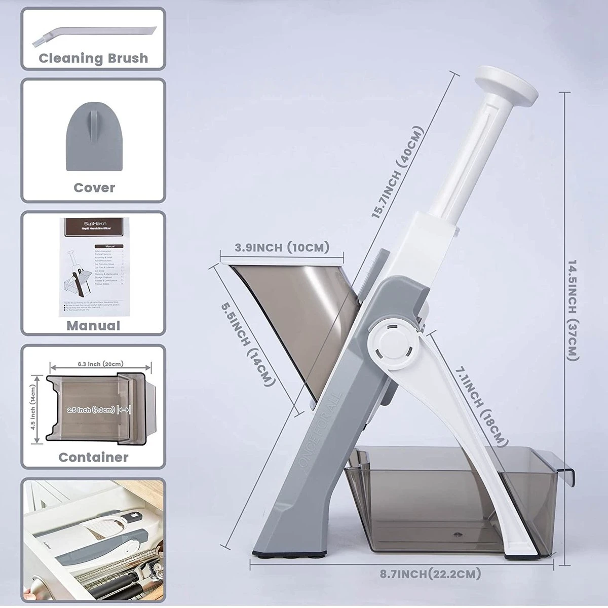 De mandoline is zeer eenvoudig in gebruik en werkt met veel verschillende soorten groenten. Deze wordt geleverd met een bakje, waar de gesneden groenten in worden opgevangen. De mandoline is zeer veilig, je handen komen niet in de buurt van het mes. De groentesnijder is ook zeer eenvoudig en veilig af te wassen en neemt weinig plek in jouw keukenkastje in.
