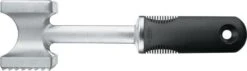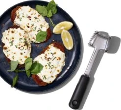 Deze tweezijdige OXO Vleeshamer is een onmisbaar item. Of u nu een goede schnitzel, carpaccio of uw vlees malser wilt maken? Het kan allemaal met deze OXO vleeshamer. De hamer heeft twee kanten. De ene kant heeft een vlakke zijde die perfect is om vlees te pletten voor schnitzels of carpaccio. De andere kant heeft een geprofileerd oppervlak waardoor het vlees weer goed mals geslagen kan worden. De hamer is gemaakt van solide aluminium en de handgreep van santoprene wat een sterk soort kunststof is. De greep voelt zacht aan waardoor het ook de hand ondersteunt en druk absorbeert.