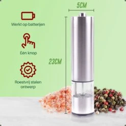 Deze elektische peper en zoutmolen met LED verlichting zorgt ervoor dat je perfect kunt doseren. Dankzij de behuizing van roestvrij staal en het ontwerp van de acrylkamer zijn de molens uiterst duurzaam en is er geen risico op glasbreuk.
