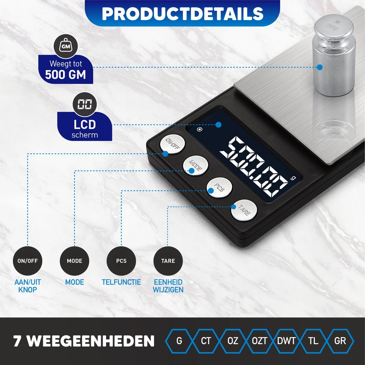 De precisie weegschaal heeft een slank, modern ontwerp en is gemakkelijk te gebruiken. Met een eenvoudig te lezen digitaal display en nauwkeurige metingen tot op de 0 01 gram, zul je nooit meer raden hoeveel je ingrediënten wegen. De weegschaal weegt uitermate nauwkeurig tot 0 01 gram. Je kunt deze weegschaal gebruiken voor producten of materialen van 0 01 tot 500 gram.