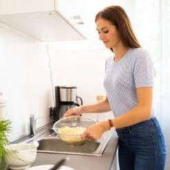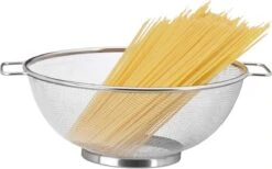 Het vergiet mag in geen enkele keuken missen. In tegenstelling tot andere vergieten is deze vergiet fijnmazig. Daardoor kan het water snel en goed oplopen. Dus je hoeft je geen zorgen te maken dat je verwaterde pasta aan je lievelingen moet serveren. Ook voor het afdruipen van aardappelen, fruit en salade is het pasta-vergiet de juiste hulp. Dankzij de voet kan hij geplaatst worden, zodat het vocht rustig kan afdruipen. Het vergiet is van roestvrij edelstaal gemaakt en kan in de vaatwasser schoongemaakt worden.
