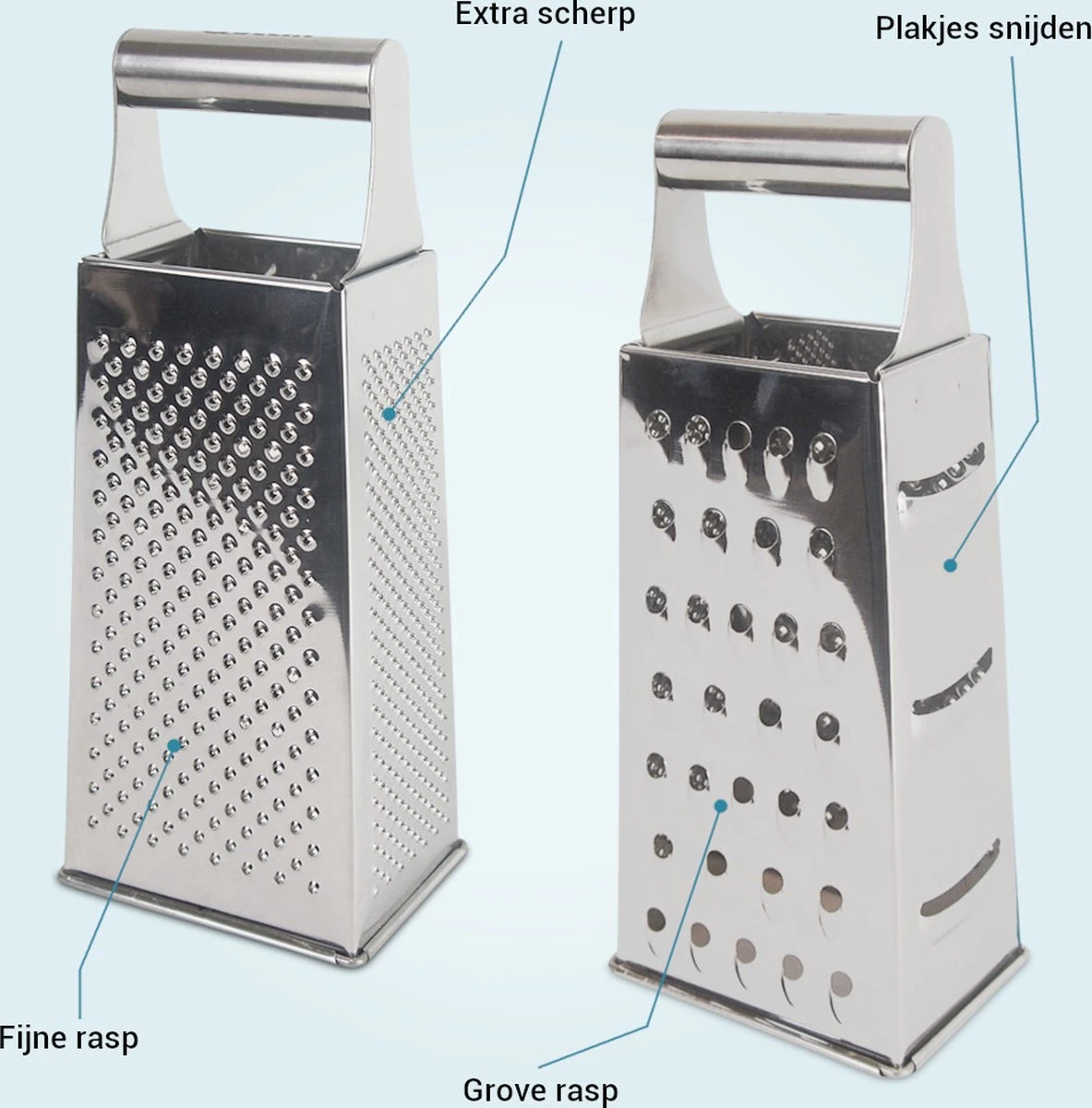 ✔ 4 verschillende raspbladen: fijn, grof, extra scherp en plakjes