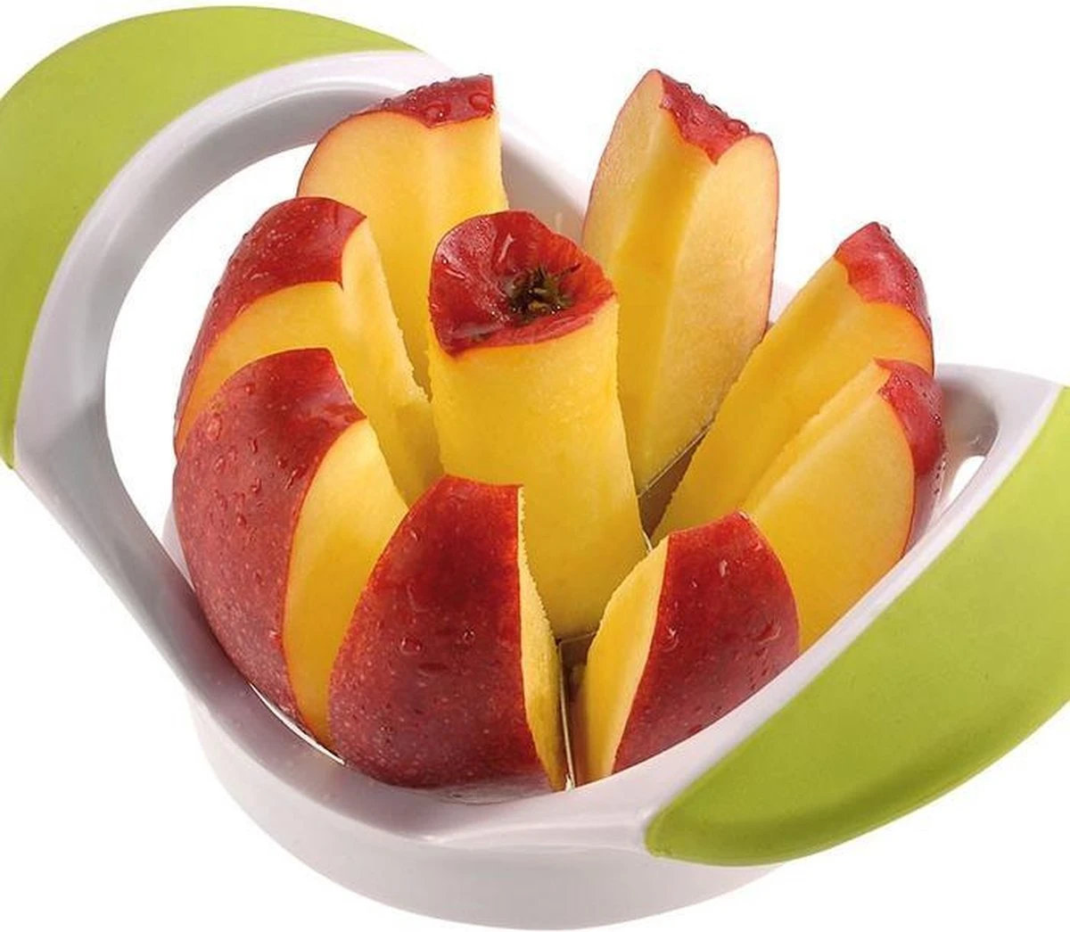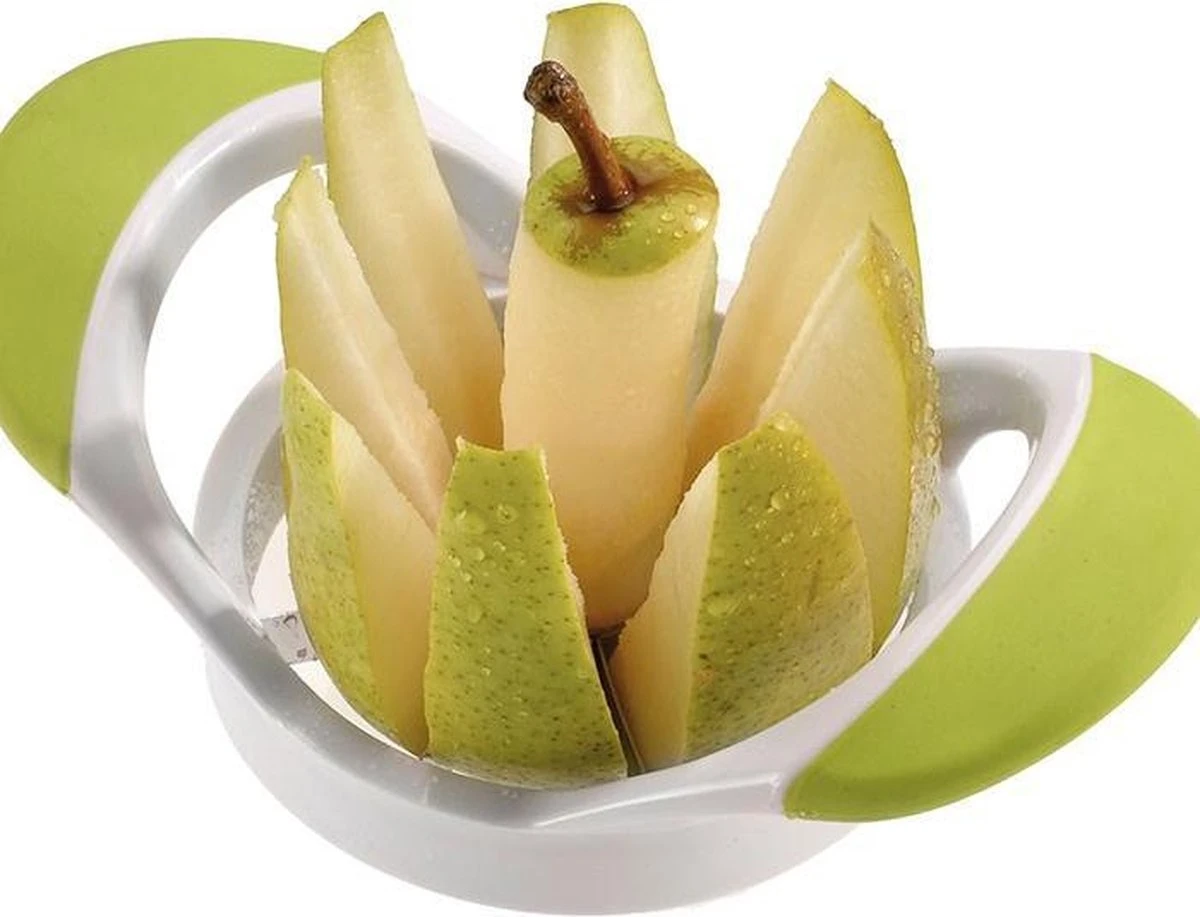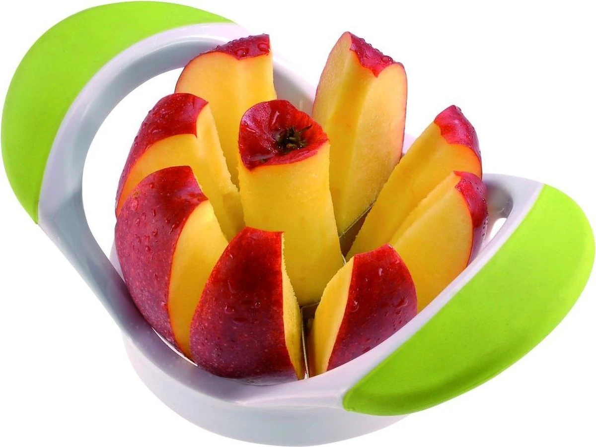 Deze appelsnijder van Westmark snijdt de appel eenvoudig in 8 gelijke stukken. Zet de appelsnijder in het midden en duw hem door de appel naar beneden. Het klokhuis zal in het middelste deel achterblijven. De softgrip voelt comfortabel en stabiel aan in de hand. De snijder is gemaakt van kunststof en heeft RVS snijbladen. De appelsnijder is na gebruik te reinigen in de vaatwasmachine. De afmeting van deze appelsnijder is 17,5 x 10,5 x 6,5 cm.