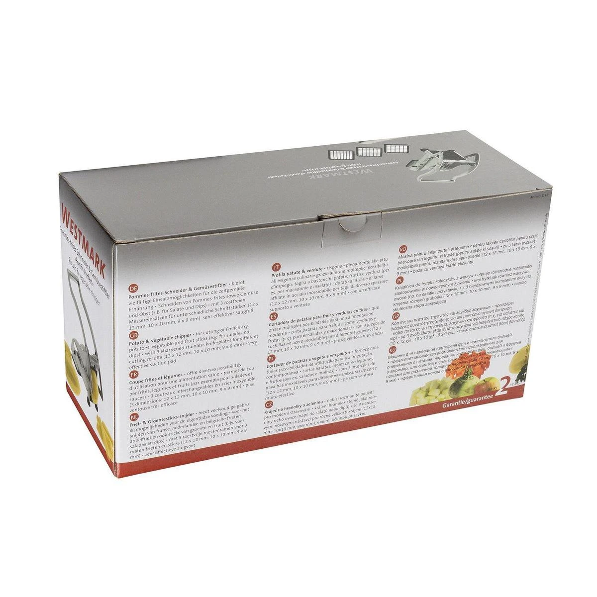 Maak zelf de lekkerste frietjes met deze handige Pomfri Perfect frietsnijder van Westmark. Deze krachtpatser heeft drie verwisselbare scherpe messenramen. De echte Hollandse frietjes maak je met het mes 10 x 10 mm, de Franse frietjes bereid je met de messen van 9 x 9 mm en voor de bekende Belgische frieten gebruik je het mes met de afmeting van 12 x 12 mm. Of je nu gek bent op dunne of dikke frieten, met deze frietsnijder maak je iedere variant in ĂŠĂŠn handomdraai. Ook voor het maken van wortel- of fruitsticks voor een feestje is deze snijder perfect te gebruiken. De frietsnijder is gemaakt van een duurzame kunststof behuizing en heeft RVS messen. Voor reiniging wordt aangeraden de messen af te spoelen met warm water en een sopje. De afmeting van deze frietsnijder is 24,5 x 9,5 x 12,8 cm.