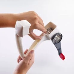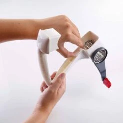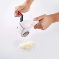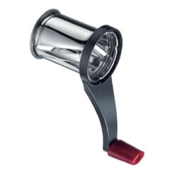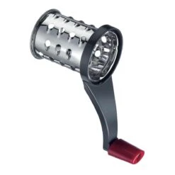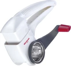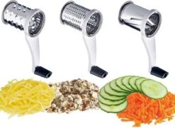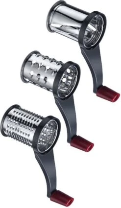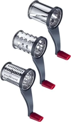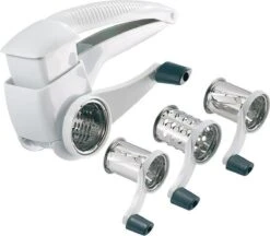 Het snijden van diverse soorten groente en noten doe je met deze Trio trommelrasp van Westmark. Deze handige trommelrasp heeft 3 verschillende trommels met diverse snijbladen. De extreem scherpe messen snijden door de meest harde groente- en notensoorten. Het apparaat is eenvoudig in gebruik. Plaats de gewenste trommelrasp in de houder en draai vervolgens aan de hendel. Het resultaat is een mooi gesneden groente of geraspte noten. En na gebruik reinig je de RVS snijbladen eenvoudig in de vaatwasmachine. De behuizing van de rasp is gemaakt van duurzaam kunststof is schoon te maken met een doekje. De afmeting van deze trommelrasp is 19 x 10,5 x 9,7 cm.