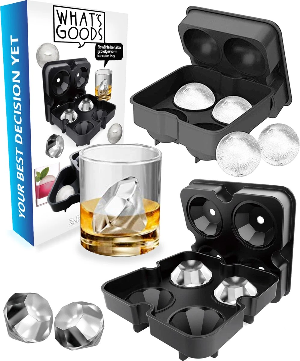 Met deze silicone ijsblokjesvormen van What’s Goods ben jij verzekerd van een koel drankje en door de 2 in 1 combi deal heb je ook nooit meer een tekort. Door de unieke vormen is elk drankje speciaal en door de langzaam smeltende ijsballen die XL formaat hebben is uw whiskey lekker lang koel maar niet meteen waterig! Het plaatsen van de ijsblokjesvorm in de vriezer is supereenvoudig met de stapelbare vormen, dat bespaart ook nog eens ruimte! Elke vorm heeft 4 ijsblokjes maar zijn veel groter dan normale ijsblokjes. Als de ijsblokjes helemaal bevroren zijn haal je ze één-voor-één uit de vorm door op de onderkant te drukken. Het vullen van de vormen kan gemakkelijk door de meegeleverde trechter, aan de bovenkant zit een gaatje waardoor je de vorm al dicht kan maken voordat je ze gaat vullen, om knoeien te voorkomen! Zijn ze vies? Doe ze in de vaatwasser of was ze zelf af met de hand. Aangezien deze siliconen ijsblokjesvormen voedselveilig zijn en ook geen BPA bevatten, kunt u ook creatief zijn door bijvoorbeeld ijsjes te maken in dezelfde vormen.